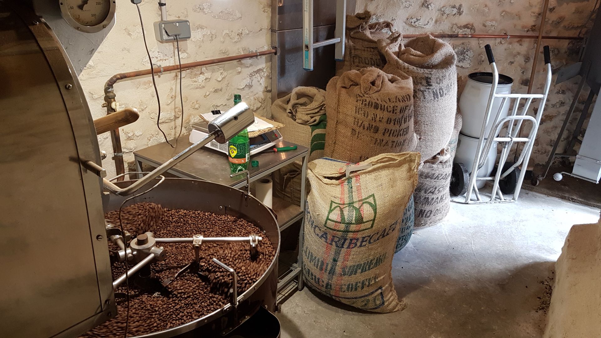 C'est un très beau projet qui voit alors le jour, en 2016, quand Pierre fait restaurer la petite réserve située derrière la cuisine de son restaurant et y installe sa première "vraie" machine de torréfaction : Un Samiac 10kg de 1984.